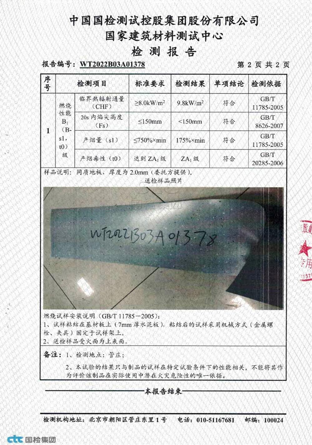 國家建筑材料測試中心防火等級(jí)檢測報(bào)告
